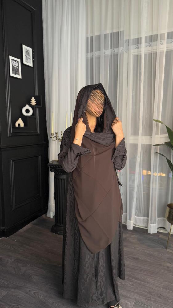 - لون العباية: بني، مع نقشة على القماش.